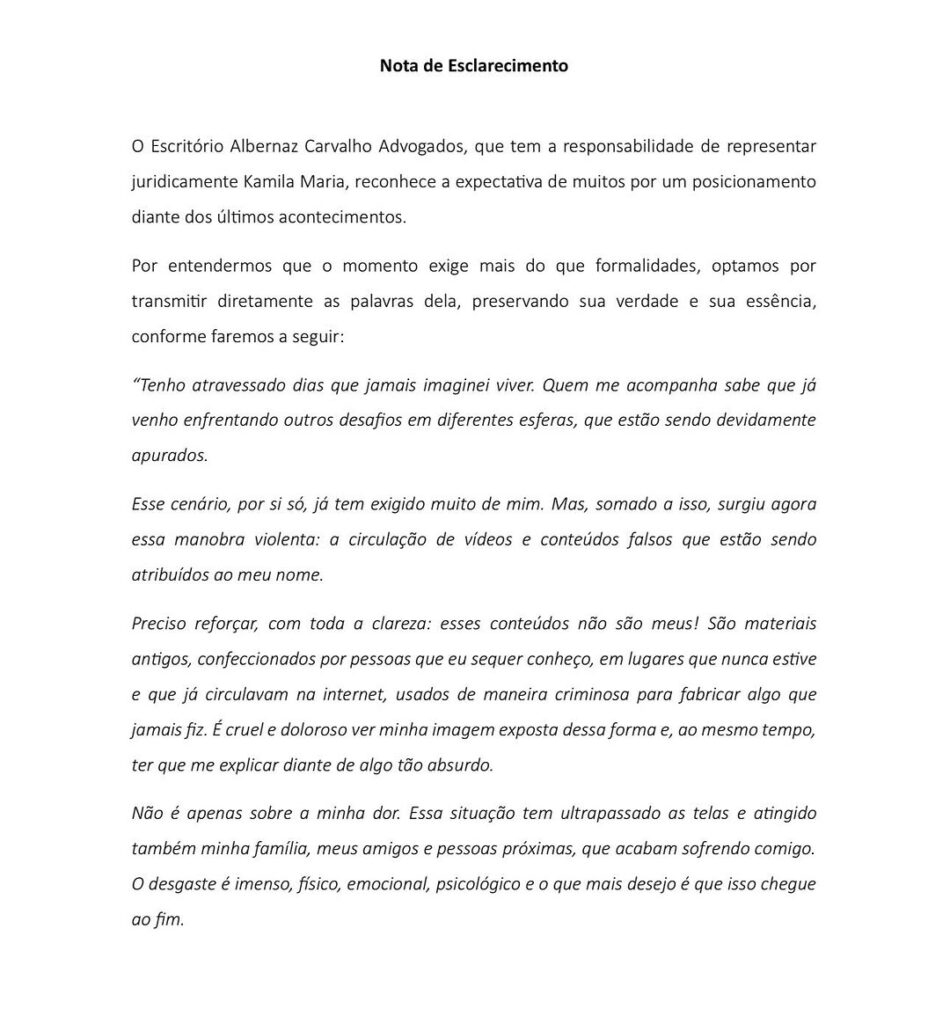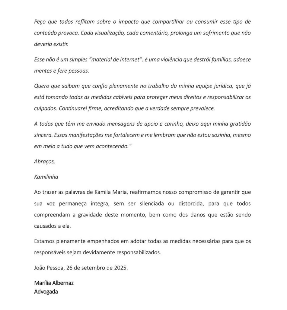 No comunicado, Kamylinha fez um apelo para que internautas não compartilhem o material. “Cada visualização, cada comentário prolonga um sofrimento que não deveria existir. Esse não é um simples conteúdo de internet, é uma violência que destrói famílias e adoece mentes”, disse.