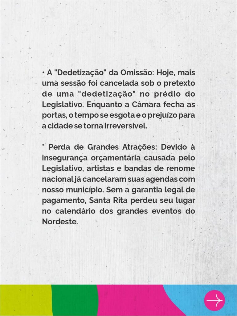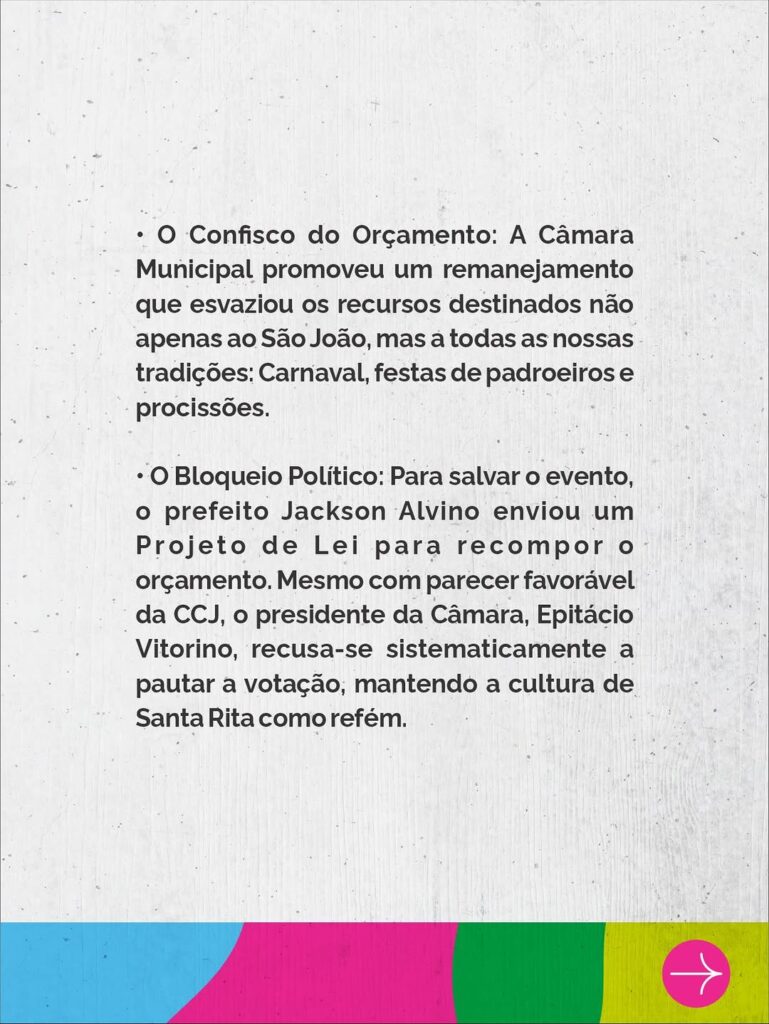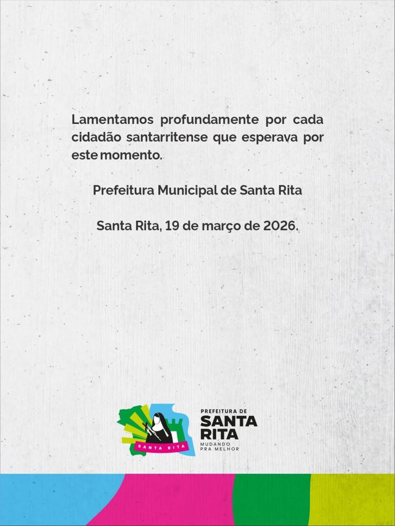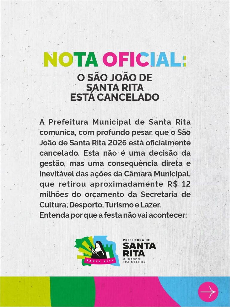 A Prefeitura de Santa Rita anunciou, na noite desta quinta-feira (19), o cancelamento do São João 2026 após a retirada de cerca de R$ 12 milhões do orçamento da Secretaria de Cultura, Desporto, Turismo e Lazer pela Câmara Municipal.